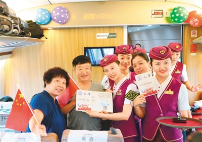 乗客に記念品を贈る「復興號」G305號の乗務員(撮影?◆広利)。