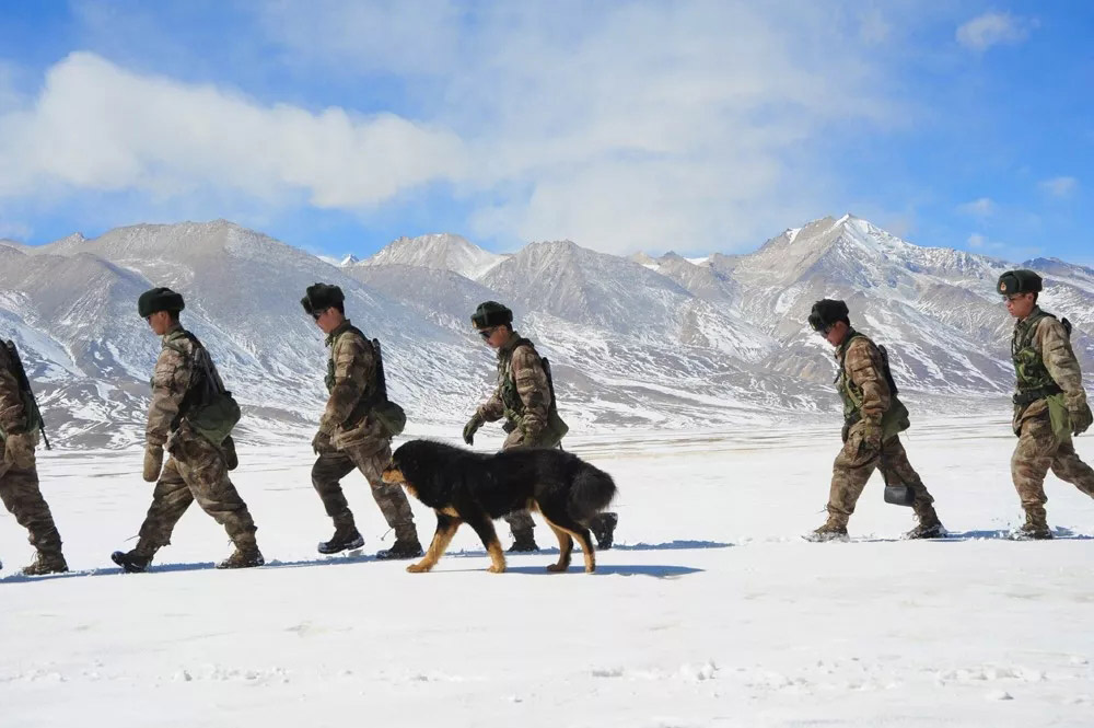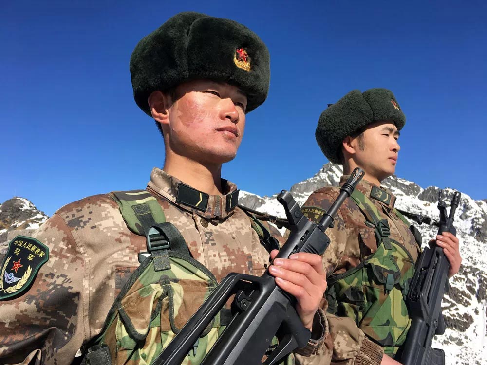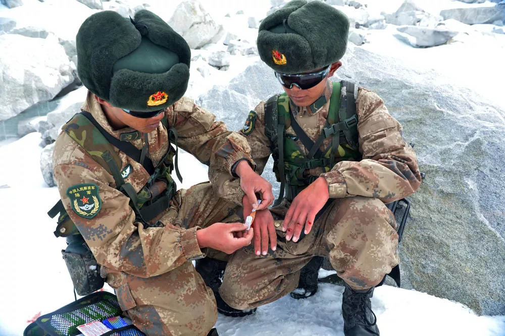 海抜4500メートル以上の雪山の山頂を年間通してパトロールする兵士たち(撮影?王乾)。