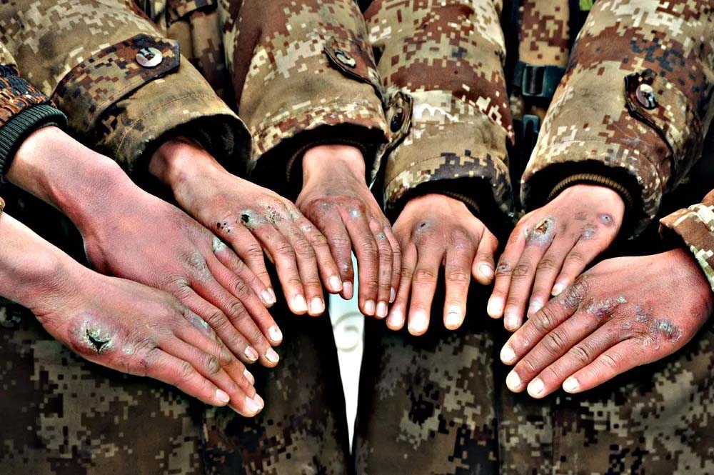 パトロール時、傷だらけになった手の応急処置をする兵士(撮影?王乾)。