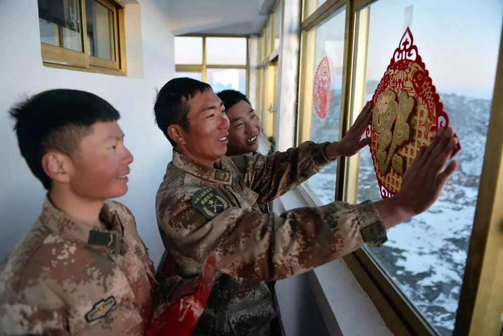 年末年始にも帰宅せず、歩哨所の窓に「福」の字を貼る兵士たち