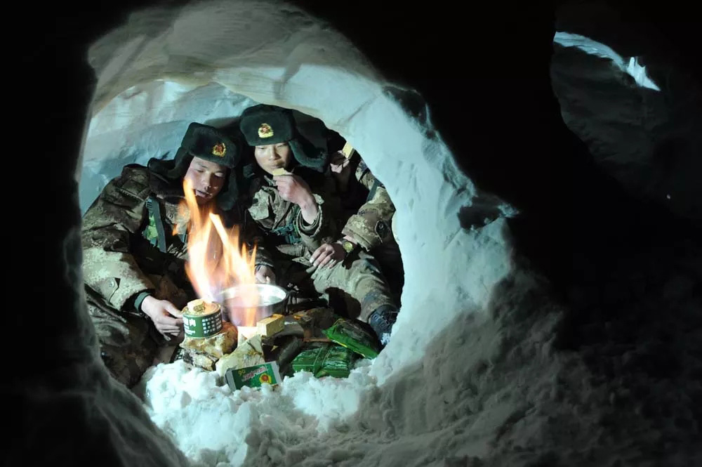 パトロールの途中、かまくらで休憩を取る昆木加歩哨所の兵士たち(撮影?王乾)