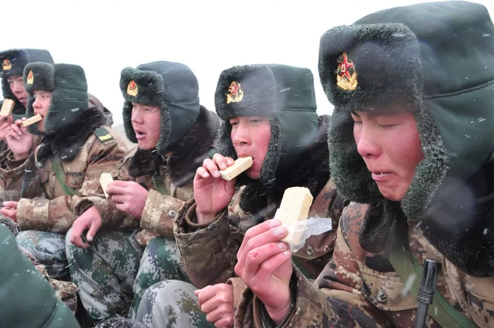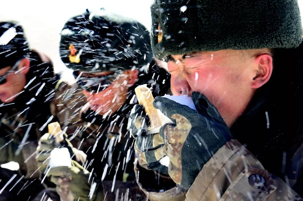 パトロール中は低溫で水筒の水が凍ってしまうため、兵士たちは雪を片手に攜帯食を食べるという特別な晝食を食べるほかない(撮影?羅凱)