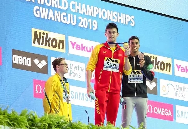 21日、韓國(guó)?光州で開催されている世界水泳選手権において、中國(guó)の五輪金メダリスト孫楊選手が競(jìng)泳男子400メートル自由形で優(yōu)勝し、同種目での世界選手権4連覇と世界選手権10冠を成し遂げた。ところが準(zhǔn)優(yōu)勝となったオーストラリア代表のホートン選手は、表彰臺(tái)に上がることを拒絶し、會(huì)場(chǎng)は騒然となった。