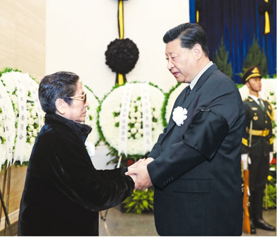 7月29日、李鵬同志の遺體が北京の八寶山革命共同墓地で火葬された。習近平、李克強、栗戦書、汪洋、王滬寧、趙楽際、韓正、王岐山、江沢民の各氏らが告別し、胡錦濤氏は外地で獻花し哀悼の意を表した。。寫真は李鵬同志の遺族と握手し、深い慰問の意を表す習近平総書記(撮影?新華社記者鞠鵬)
