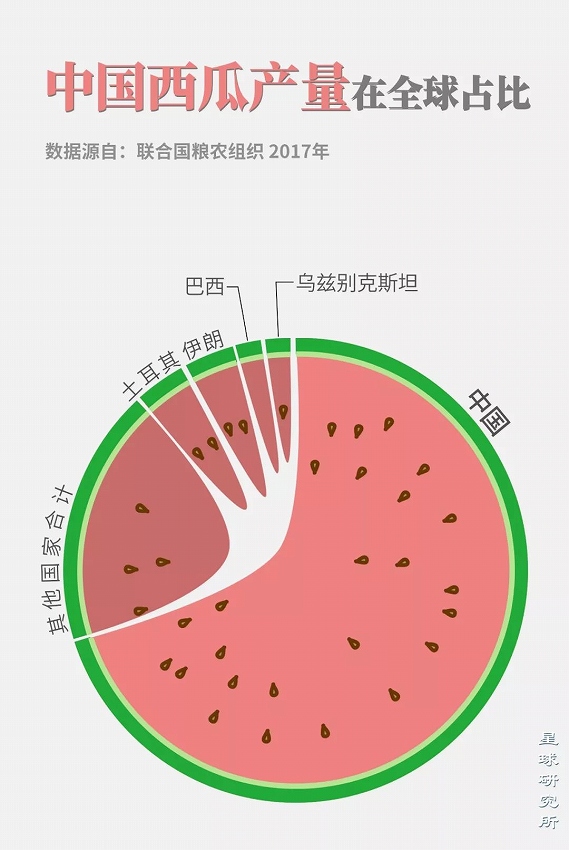 (中國のスイカ生産量が世界総生産量に占める割合。グラフ作成:張靖&鞏向傑/星球研究所)