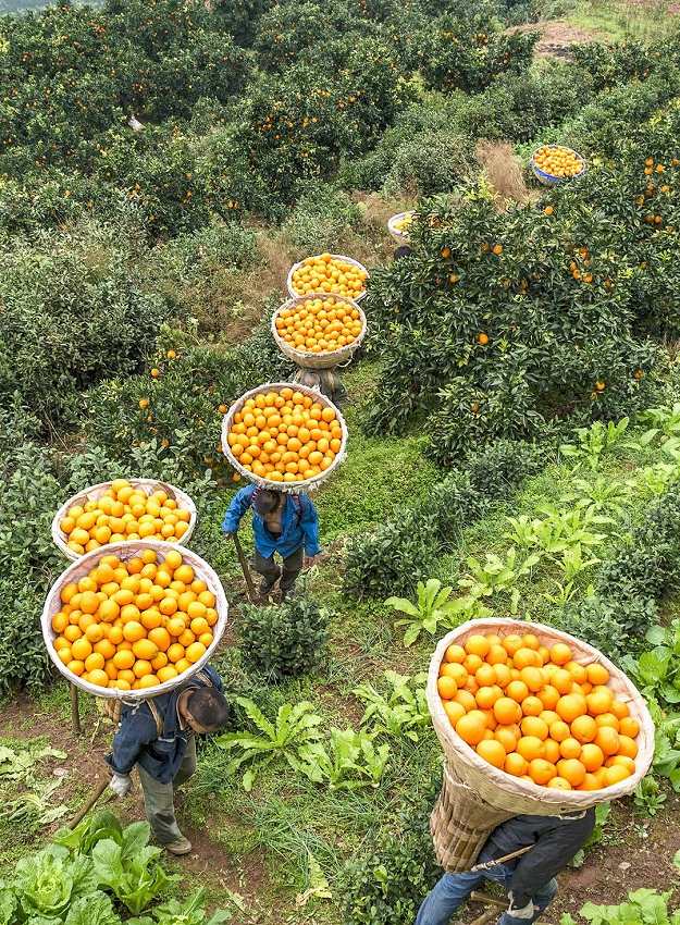 (湖北省宜昌市?シ帰県の河口鎮(zhèn)で、ネーブルオレンジを運(yùn)ぶ村民たち。畫像提供:VCG)