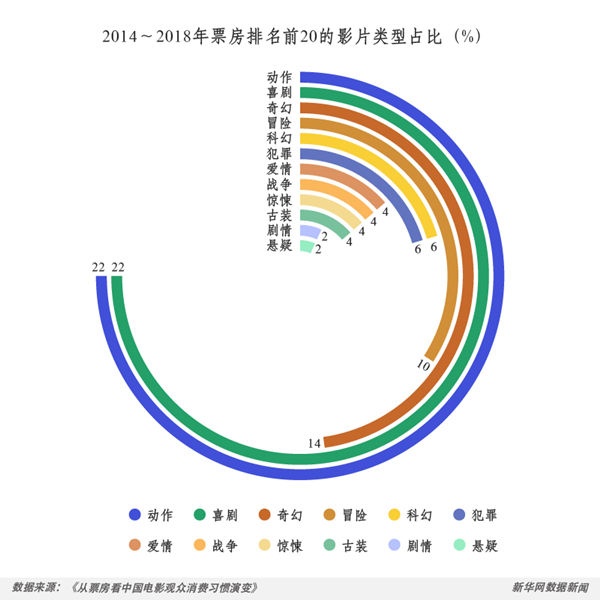このようにジャンルミックスが進む中で、中國では、コメディ映畫やアクション映畫が近年最も人気のジャンルとなっており、ファンタジーや冒険などがそれに続いている。