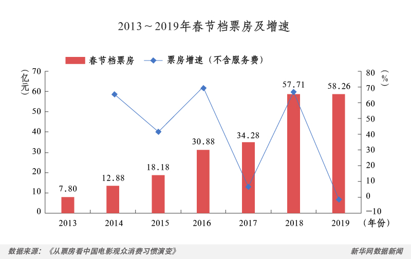 13年から、春節(jié)映畫の興行収入は右肩上がりで増加し、13年に7億8千萬元だった興行収入が19年には58億2600萬元に達し、6年で約6.5倍増えた。特に17‐18年には、興行収入が70%増と激増し、春節(jié)映畫の映畫館観客著席率は普段を大きく上回っている。