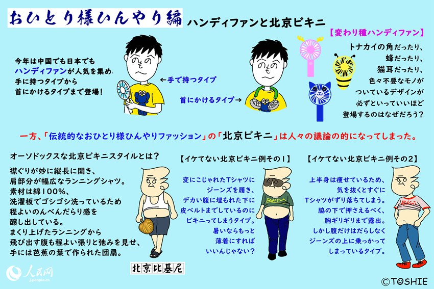 今年は中國でも日本でもハンディファンが人気を集め、手に持つタイプから首にかけるタイプまで「マイ?風(fēng)」と共に街行く人が數(shù)多くみられた。このように「おひとり様ひんやりグッズ」が人気を集める一方で、「北京ビキニ」と呼ばれる「伝統(tǒng)的なおひとり様ひんやりファッション」は公共の場に相応しい恰好ではないと批判的な聲が挙がるなど、人々の議論の的となってしまった。