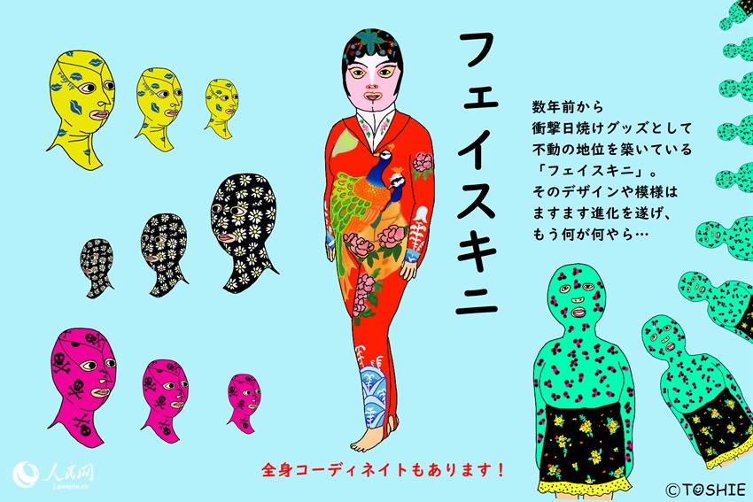 數(shù)年前から衝撃日焼けグッズとして不動(dòng)の地位を築いている「フェイスキニ」。山東省青島生まれのこの海辺での日焼け対策グッズは當(dāng)初「強(qiáng)盜マスク」のような顔全體を覆うそのデザインが驚きだったが、そのデザインや模様がますます進(jìn)化を遂げ、衝撃度をいや増している。