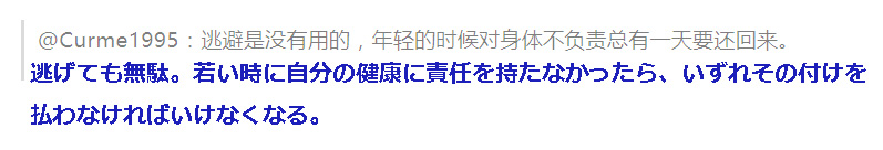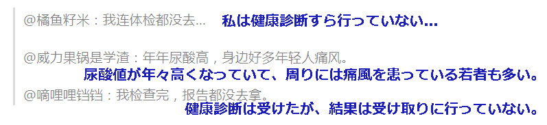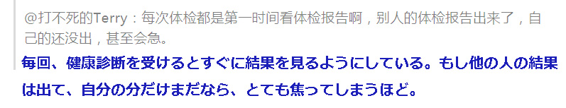 あるネットユーザーは、「健康診斷を受けなければ病気も存在しない」と冗談交じりに投稿している。また、「健康診斷を受けるのは心理的受容力が試される最大の難関かも」、「大人にとっての精神的挫折は、実は健康診斷の結果を見たその時から始まる」などのツッコミコメントもみられた。