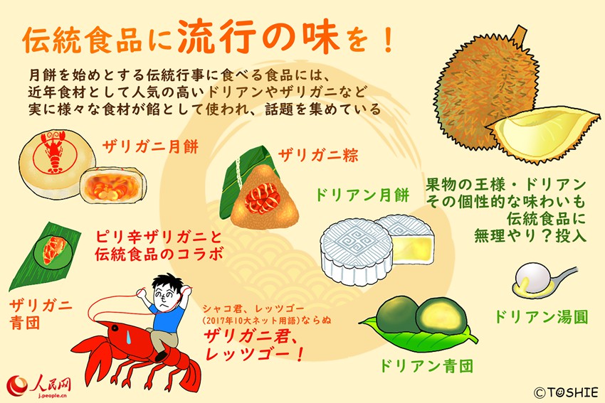 日本でも流行の食材や味などが登場(chǎng)すると、ありとあらゆる料理やお菓子などにそれらが使われるということはあるが、中國(guó)では元宵節(jié)(舊暦1月15日、今年は2月19日)で食べられる湯圓(もち米粉で餡を包み茹でた団子)と中秋節(jié)の月餅にその傾向が顕著にみられる。また最近では清明節(jié)(先祖を祭る中國(guó)の伝統(tǒng)的な祭日、今年は4月5日)に食べられる青団(もち菓子)や端午節(jié)(端午の節(jié)句、今年は6月7日)のちまきもこれに仲間入りしており、近年食材として人気の高いドリアンやザリガニももれなくこうした伝統(tǒng)食品の餡として使われている。
