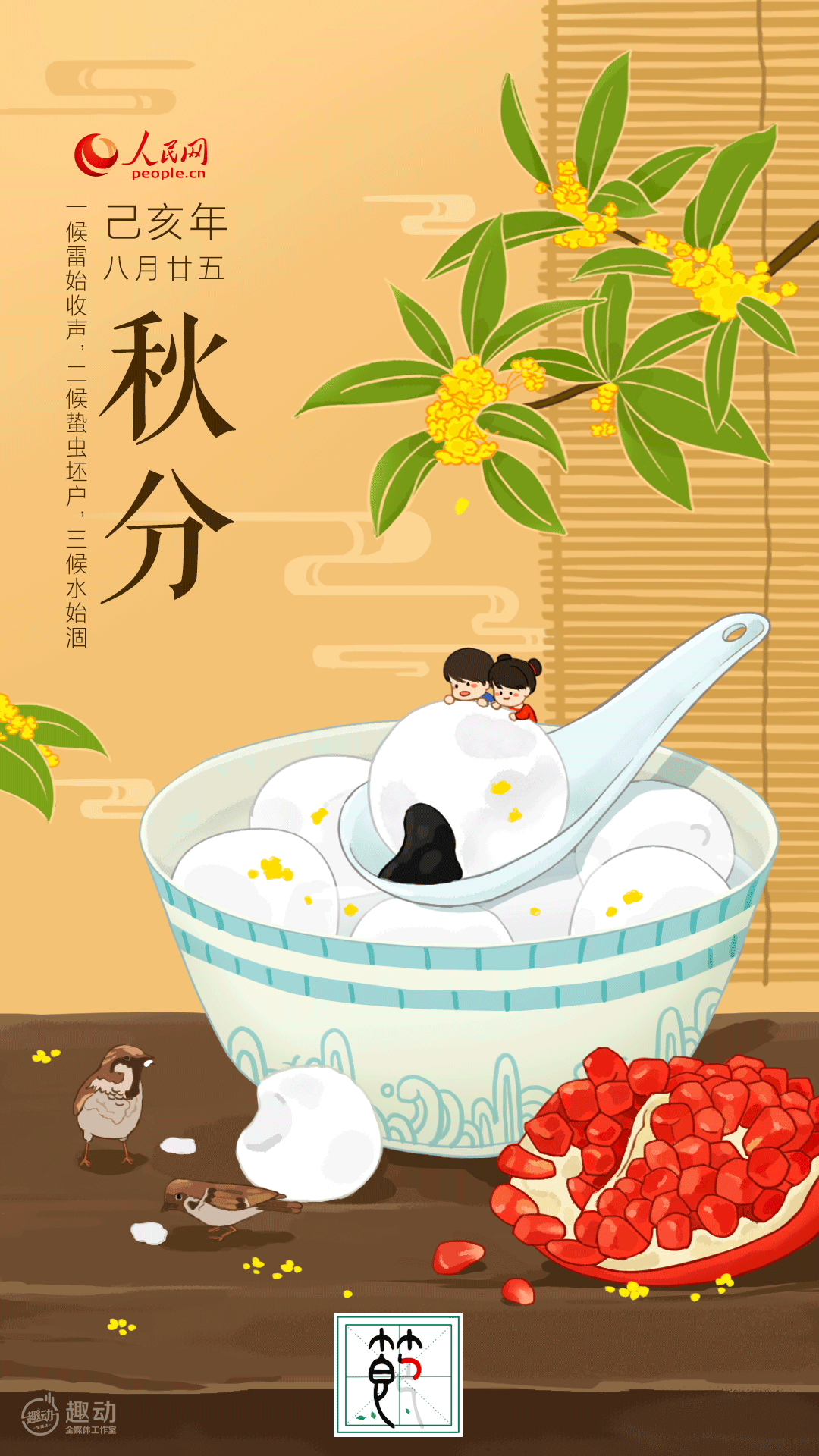 「秋分」は古くからの節(jié)気で、通常、毎年9月22日または23日におとずれる。この日、太陽(yáng)の黃経がほぼ180度に達(dá)し、南?北半球とも晝と夜の長(zhǎng)さがほぼ同じとなる?!盖锓帧工我馕钉洗螭证堡?つある。まず、秋分は、90日間におよぶ秋季のほぼ真ん中に位置する。2番目に、秋分には、1日24時(shí)間のうち、晝と夜の長(zhǎng)さが12時(shí)間ずつで同じになる。秋分が到來すると、もみじが色づき、稲が黃金色に実り、金木犀の馨しい香りが漂い、蟹が肥え、菊が鮮やかな黃色になり、そこかしこに広がる秋景色が人々を魅了する。