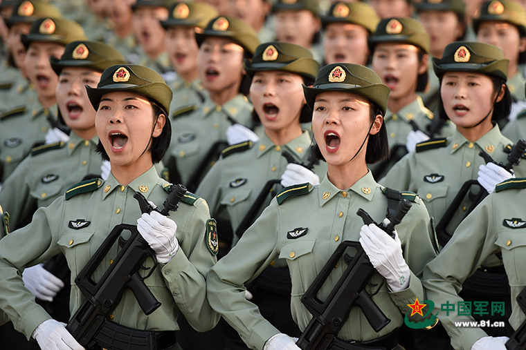 通常の行進から足上げ行進への切り替え訓(xùn)練をする女性兵士隊員たち。熱波がコンクリート地面から立ち上り、隊員たちは熱い血潮あふれる胸から聲を発し、彼女たちが叫ぶスローガンは訓(xùn)練場全體に響き渡った。
