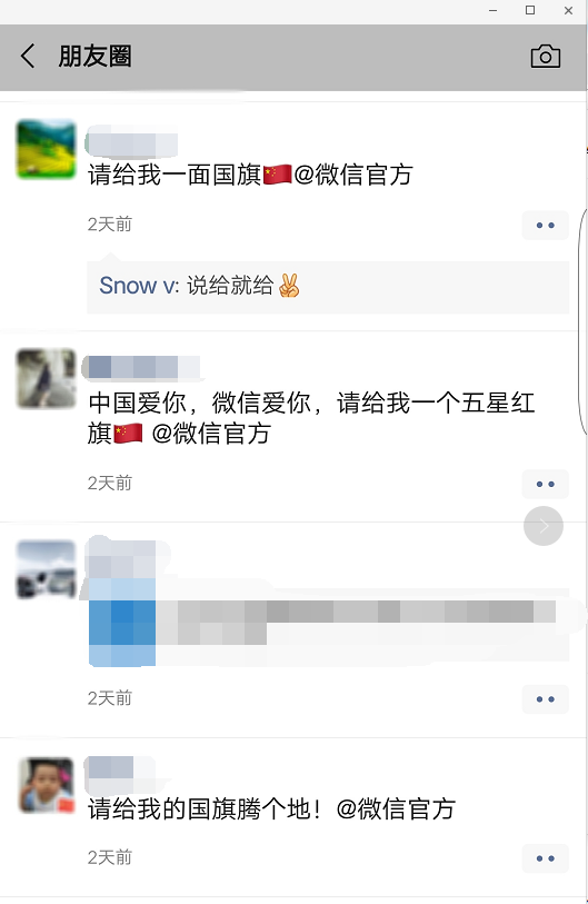 ネットユーザーは、そのトレンドに乗り、微信にアットマーク付けして願(yuàn)いことを投稿し、モーメンツはたちまち盛り上がりを見せた。また、多くの微信の公式アカウントもその波に乗り、自身のアカウントに、「中國(guó)國(guó)旗付きのプロフィール畫像」にするための方法を紹介。なかには、「中國(guó)國(guó)旗付きの畫像をちょうだい」というアカウント名の公式アカウントを立ち上げたIT企業(yè)もある。