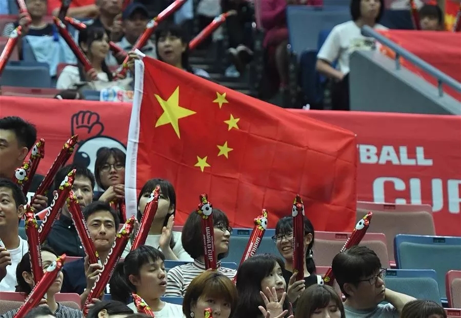 9月28日、試合中に中國(guó)國(guó)旗を掲げるバレーボールファン(撮影?賀燦鈴)。