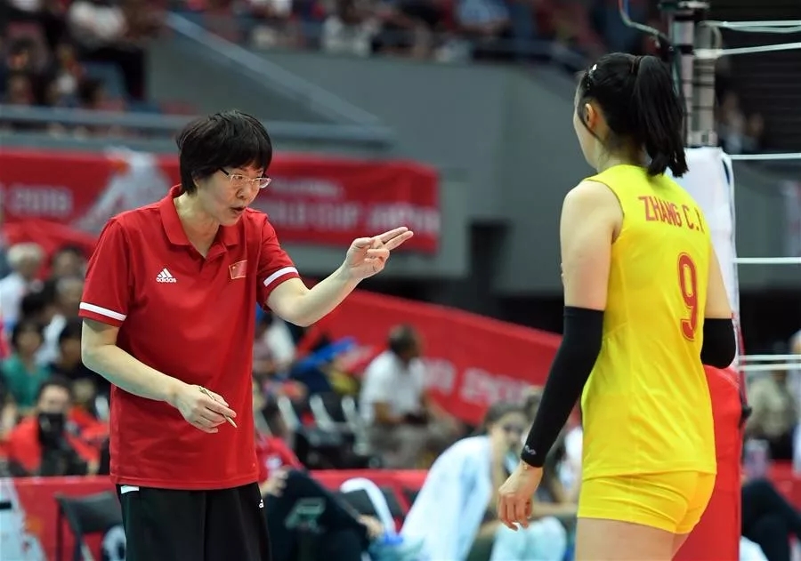 9月28日、試合の合間に選手に指導(dǎo)する中國(guó)チームの郎平監(jiān)督(左、撮影?賀燦鈴)。