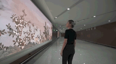 空港2階の國際線到著ロビー通路にある「帰鳥集」と「微笑みウィンドウ」は、どちらもインタラクティブな映像インスタレーション作品。「帰鳥集」は、中國の宋代花鳥畫の視覚言語を用い、精密で変化に富んだデジタル花鳥絵巻を作り上げている。