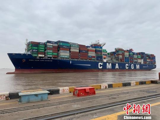 洋山港に入港したトルコの展示品を積んだ「CGM ARKANSAS」 (撮影?楊大勇)。