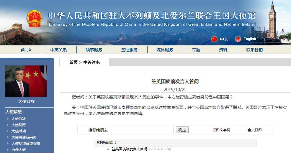 在英中國大使館公式サイトによると、在英中國大使館の広報(bào)擔(dān)當(dāng)者は、英國東部エセックス州で発見された39人の遺體の身元について、大使館はすでに參事官を現(xiàn)地に派遣し、現(xiàn)地警察と連絡(luò)を取り合っていることを明らかにした。英國警察は、遺體の身元確認(rèn)を現(xiàn)在進(jìn)めているが、中國國籍か否かについては現(xiàn)時(shí)點(diǎn)では確定できないとしている。人民網(wǎng)が報(bào)じた。