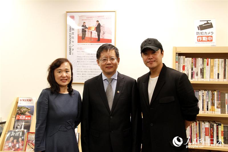 中國文化センターで記念寫真を撮影した北京市黨委員會宣伝部の趙衛(wèi)東?常務(wù)副部長(寫真中央)、中國文化センターの馬暁▲副センター長(寫真左、▲は王へんに深のつくり)、中國の陳思誠監(jiān)督(寫真右、撮影?李沐航)