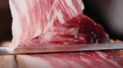 紙のように薄い紅赤色のハムの周囲をピンク色の脂肪分が雲(yún)のように取り囲む。筋肉をつなぐ繊維質(zhì)は糸のように密で大理石に似た綾を織りなす。一口食べてみると、ほおの中に一杯に広がる柔らかい絶妙なうまみの虜になる。