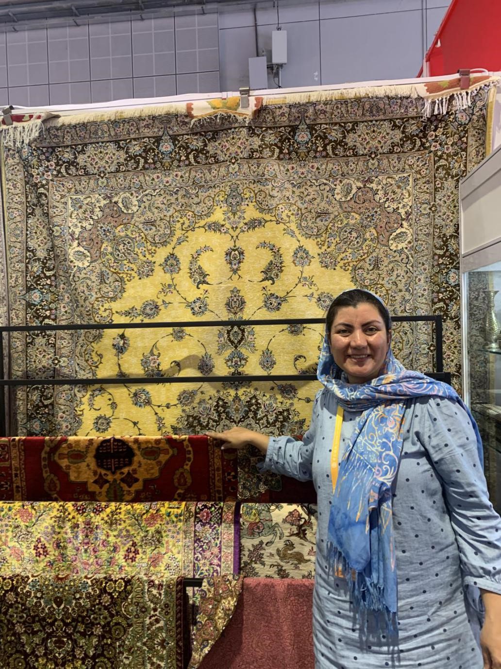 自社製品である手作りペルシャ絨毯を紹介するイランのマリーさん(撮影?王慧)。
