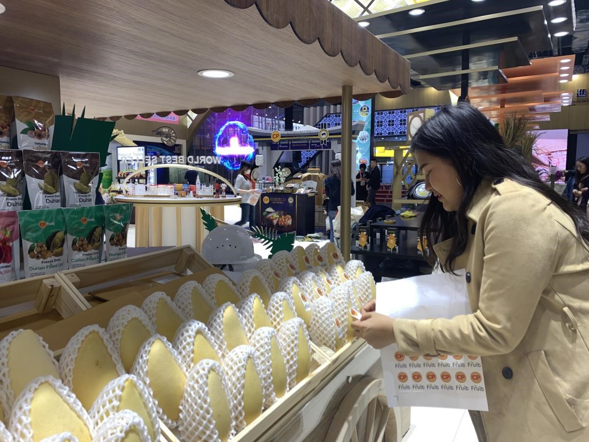 タイのCPグループのブースで、陳列ケースを整理したりラベルを貼ったりするスタッフ(撮影?王慧)。