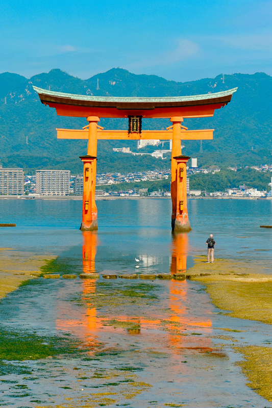 日本三景の一つである宮島は、海に浮かぶ大鳥居がシンボルだ。青い海や緑の山をバックにした朱色の鳥居はひときわ目を引く。