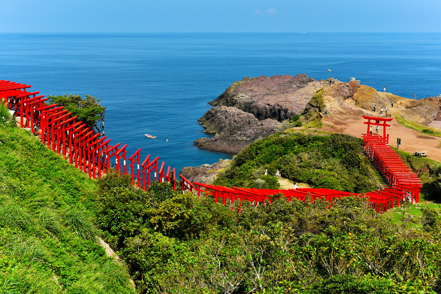 青空の下の元乃隅稲荷神社はとても美しい。赤い鳥居とコバルトブルーの日本海のコラボが神秘的な景色を生み出している。
