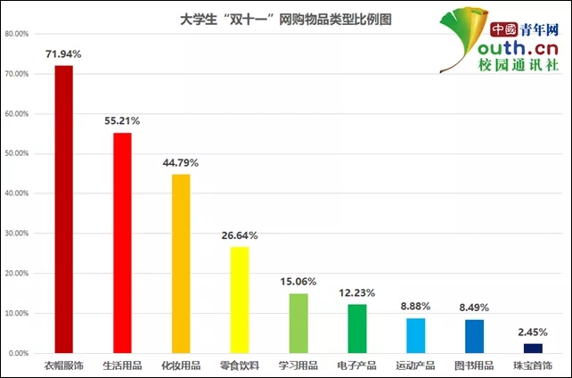 中青網(wǎng)教育の報(bào)道によると、中國(guó)全土の大學(xué)生1008人を?qū)澫螭摔筏俊弗昆芝?1」に関するアンケート調(diào)査で、大學(xué)生の約8割が「生活費(fèi)を使って買い物をする」と答えた。購(gòu)入する商品は主に衣類や生活用品、コスメ商品だった。どれぐらい使うかに関して、大學(xué)生の8割近くが「700元以內(nèi)」と答えた。