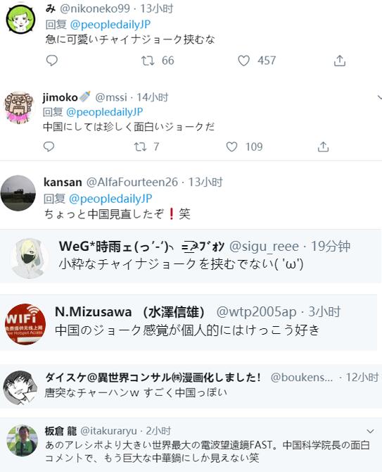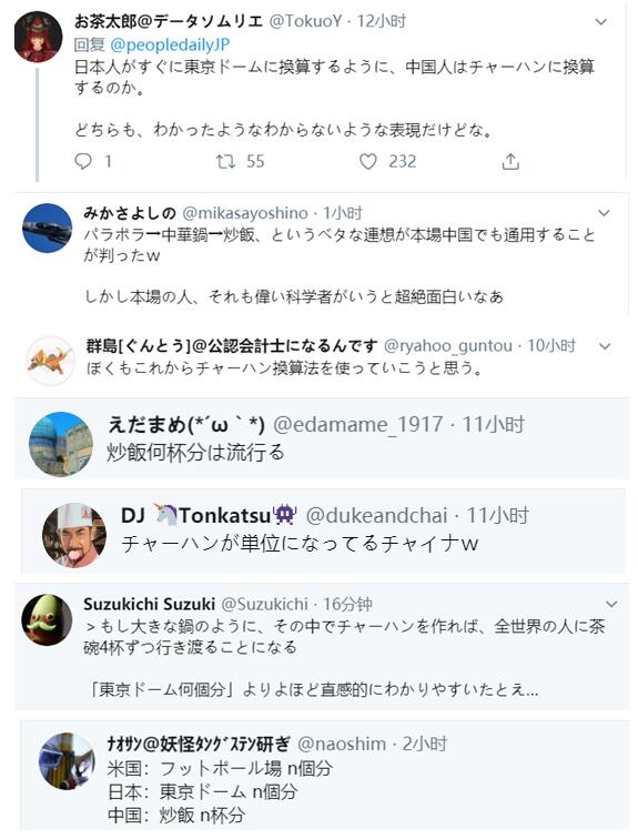 この電波望遠(yuǎn)鏡を中華鍋に例えるユニークなスピーチ內(nèi)容が人民網(wǎng)の日本語版ツイッターの公式アカウントで配信されると、日本のネットユーザーもたちまち反応?!笘|京ドーム何個分よりよほど直観的にわかりやすい例え」や「僕もこれからチャーハン換算法を使っていこうと思う」といった換算法に対するコメントから、「パラボラ→中華鍋→炒飯というベタな連想が本場中國でも通用することが分かった。しかし本場の人、それも偉い科學(xué)者が言うと超絶面白いなぁ」や「中國科學(xué)院院長の面白コメントで、もう巨大な中華鍋にしか見えない」といったそのユニークさを稱えるコメント、そして「これを見るとやはりこれから科學(xué)技術(shù)も中國がリードしていくんだろうなと感じる」や「羨ましい。今後も発展していく未來を感じる。日本みたいにしぼんでいく感じが漂っていない」と中國の科學(xué)技術(shù)の発展に感心や羨望を示すコメントも見られた。