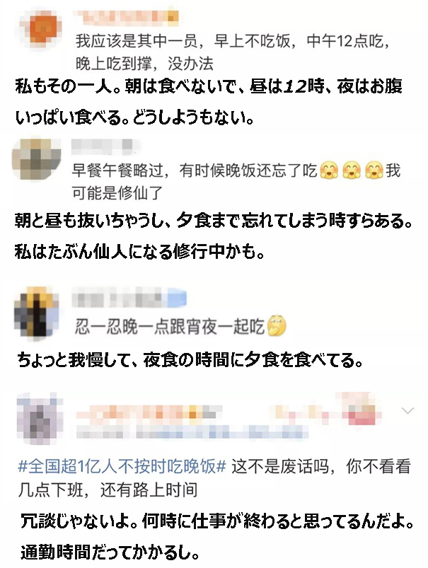 実際のところ、食事時間が不規(guī)則という人は想像よりずっと多い。微博(ウェイボー)で最近、ハッシュタグ「中國全土で夕食時間が不規(guī)則な人は1億人以上」が大きな話題となっている。第三者機関の最新の統(tǒng)計によると、食事時間が不規(guī)則な人はとても多く、なかでも様々な理由から夕食時間が不規(guī)則という人が1億200萬人と最も深刻だった。北京、上海、広州、深センなどの一線都市では、長期間にわたって食事時間が不規(guī)則という人が約750萬人に達している。