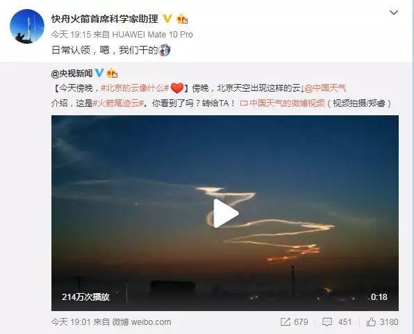 その後、航天科工火箭技術(shù)有限公司の技術(shù)責(zé)任者がこれは「ロケット雲(yún)」と確認(rèn)し、「當(dāng)社が打ち上げたロケットの噴煙」と説明した。