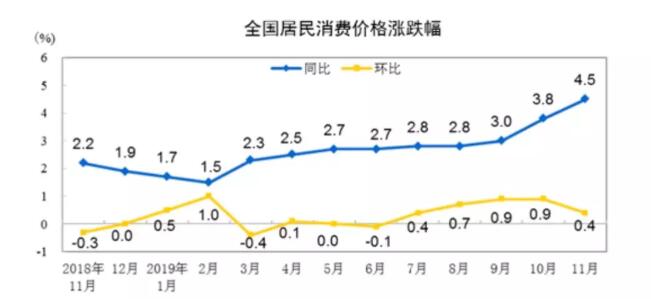 國(guó)家統(tǒng)計(jì)局は10日、今年11月の全國(guó)の消費(fèi)者物価指數(shù)(CPI)と生産者物価指數(shù)(PPI)の各データを発表した。それによると、同月のCPIは前年同期比4.5%上昇し、前月比では0.4%上昇した。