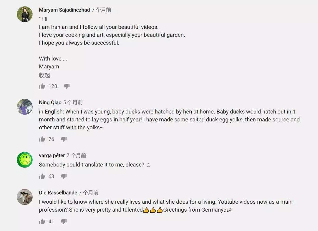 李さんの動畫に寄せられているコメントを見ると、彼女のファンは世界中にいることが分かる。例えば、7ヶ月前に李さんが投稿した動畫は中國語のタイトルで、英語字幕もつけられていないにもかかわらず、中國語が分からないはずのイランや米國、ロシア、フィリピン、ブラジルなどのファンから賞賛するコメントが寄せられており、「翻訳して」と求めるコメントも見られた。
