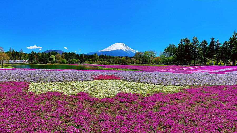 毎年4月から5月にかけて、富士山麓に一面に咲く芝桜は花の絨毯そのもの。その美しい景観を一目見ようと大勢の観光客が詰めかける。