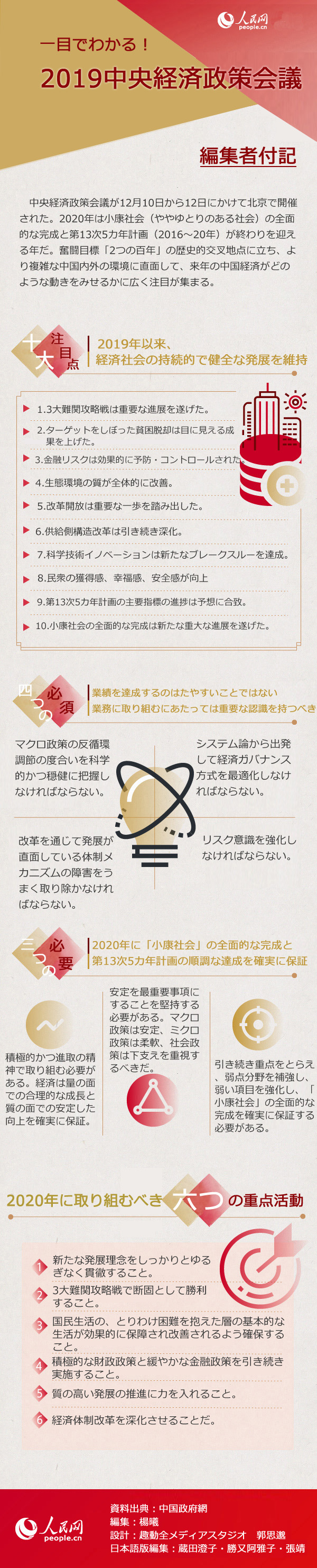 中央経済政策會議が12月10日から12日にかけて北京で開催された。2020年は小康社會(ややゆとりのある社會)の全面的な完成と第13次5カ年計畫(2016~20年)が終わりを迎える年だ。奮闘目標「2つの百年」の歴史的交叉地點に立ち、より複雑な中國內外の環(huán)境に直面して、來年の中國経済がどのような動きをみせるかに広く注目が集まる。