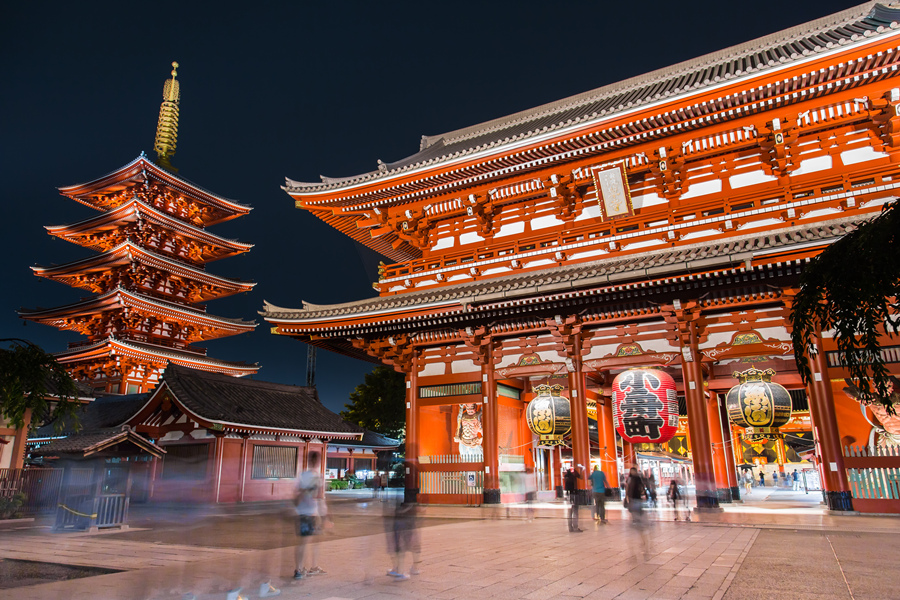 夜の淺草寺は寶藏門に掲げられている大提燈が赤く光り幻想的な雰囲気が漂っている。また、五重塔と寶藏門がライトアップされ美しく輝き、観光客らが絶え間なくやって來(lái)る。その賑やかさは、大提燈やライトが消えるまで続くのだろう。