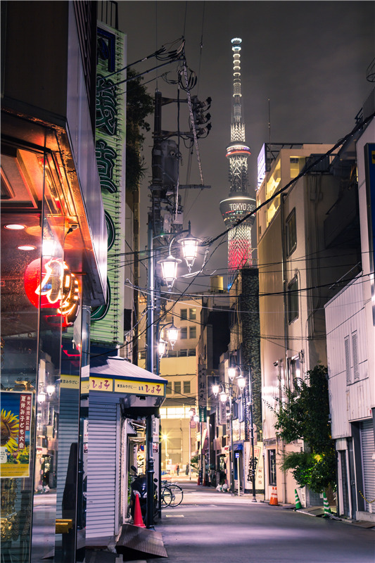 「無(wú)人の淺草の路地裏から見えるスカイツリー」