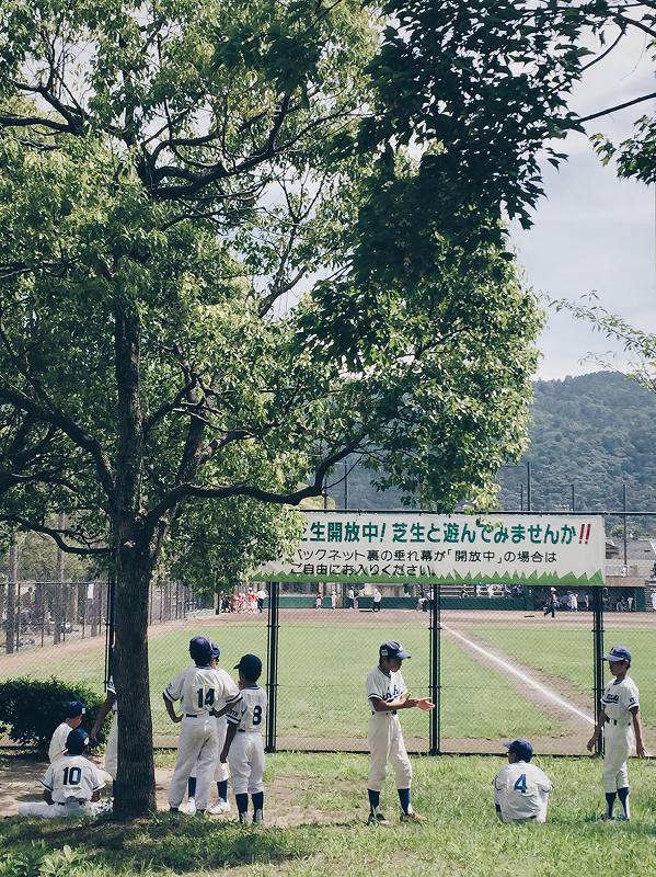 學(xué)校近くの木の下で、休憩する野球少年たち。座ったり、立っていたり、おしゃべりする子供たちも。そんな子供たちの様子を切り取ってみた。