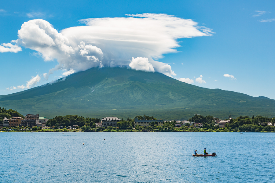 遙か彼方の富士山頂に集まった雲(yún)はまるで巨大なUFOのようで、夏の日の富士山頂に一種獨(dú)特の趣を添えていた。湖面では釣り糸を垂らしてのんびりと釣りを楽しむ人。初めてこの地を訪れたものとしてはそんな素晴らしい暮らしをつい羨ましく感じた。