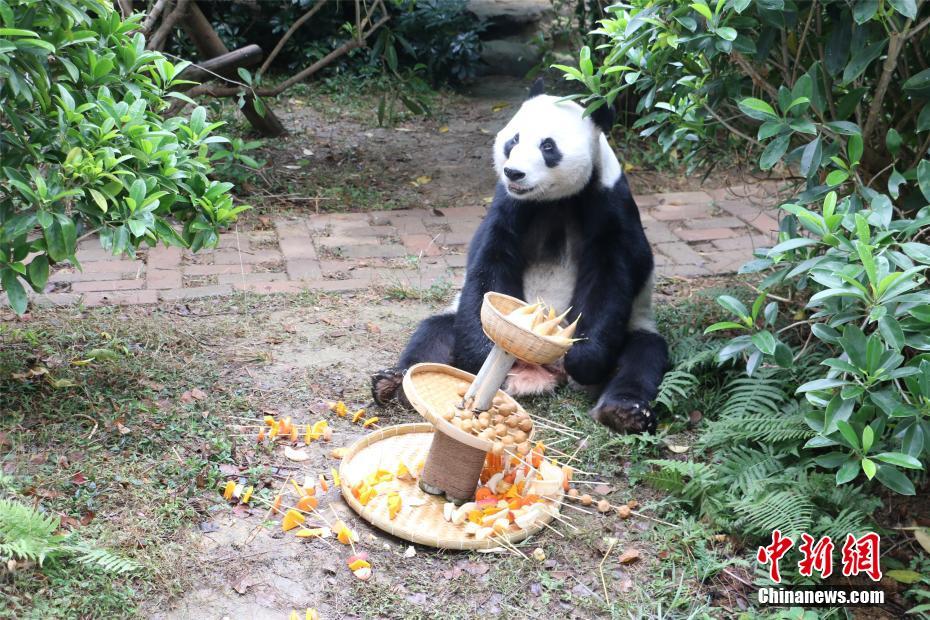 嬉しくてたまらないといった様子で串刺しされたエサを頬張り、「特製火鍋」で誕生日を祝ってもらった帰國パンダの「明浜」(撮影?林馨)。