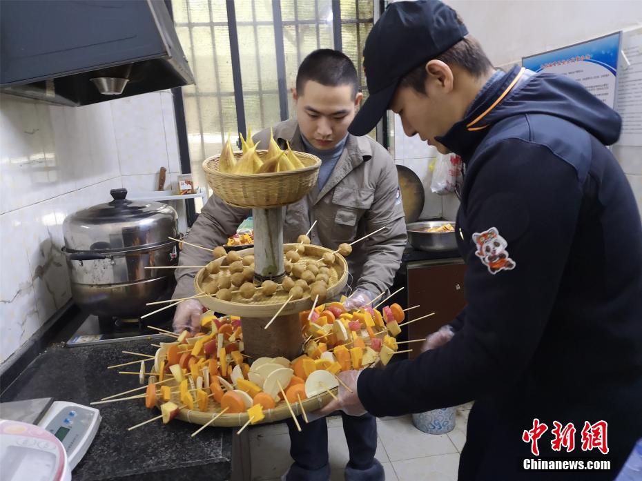 明浜の13歳の誕生日を祝って、竹製のかごやざると竹筒を使って數(shù)段重ねになった火鍋のような入れ物を作り、トウモロコシの蒸しパンや、リンゴなどのエサを串に刺して火鍋の具のようにしたエサを準(zhǔn)備した柳州動(dòng)物園(撮影?林馨)。