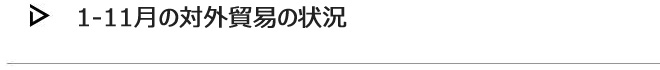 11月の輸出入額は2兆8600億元で同1.8%増加。うち輸出は1兆5700億元で同1.3%増加、輸入は1兆2900億元で同2.5%増加し、貿易収支は2742億1千萬元で同4.1%縮小した。