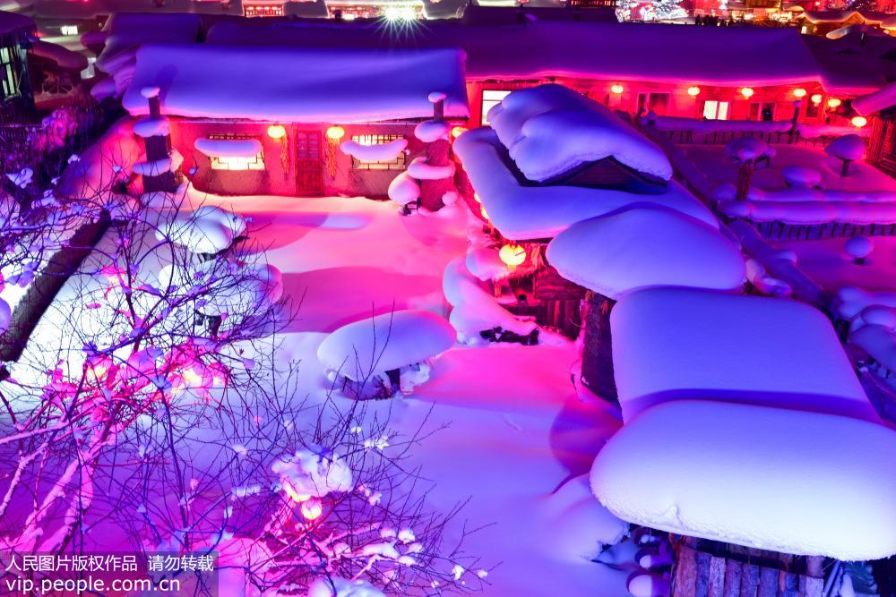 資料寫真、夜にライトアップされた黒竜江省牡丹江市の雪郷景勝區(qū)。