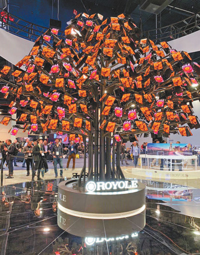 柔宇科技の「柔樹」が見どころになった。その高さは約5メートルで、1000枚に近い全柔軟性ディスプレイの「葉」からなっている。全柔軟性の葉は本物の葉のように揺れ動き、輝きを放つだけでなく、すべての「葉」が単獨で畫像や動畫などの高畫質(zhì)コンテンツを表示できる。ユーザーは攜帯アプリにより遠隔操作で畫像や動畫をアップし、これを組み合わせることで創(chuàng)意あふれる効果を発揮できる。