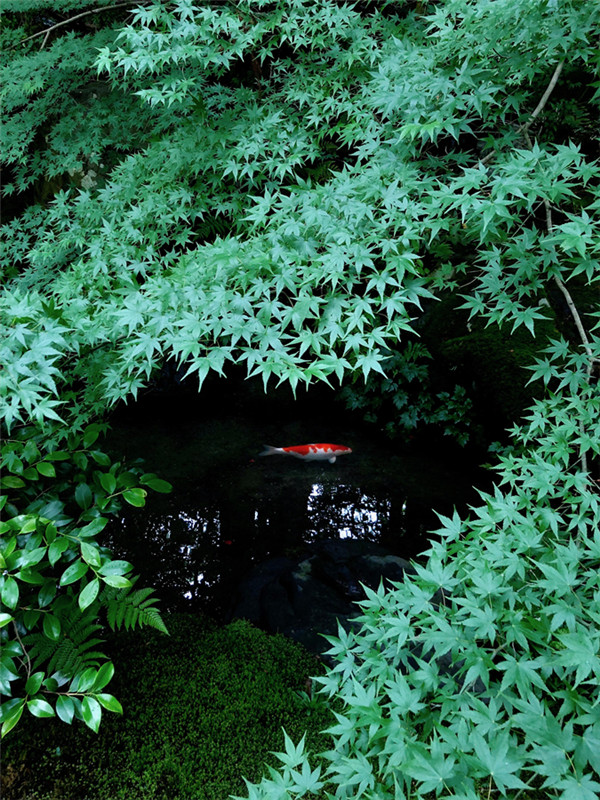 深い緑に囲まれた琉璃光院の池に、ふいに姿を見せた紅白の錦鯉。まるで空中に浮遊しているかのように幻想的だった。(作者:AmyLi。撮影場所:京都府?琉璃光院)