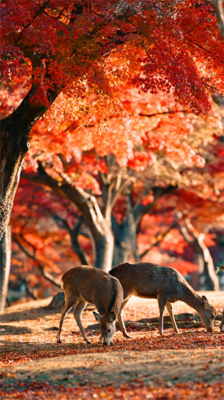秋の奈良公園で、モミジの葉が色づき、朝日が差し込む林の中で、二頭のシカが草を食んでいた。止まったまま、あるいは移動しながら草を食む姿は、大自然との調(diào)和が描き出された絵巻のようだった。(作者:Jamie醤。撮影場所:奈良県?奈良公園)