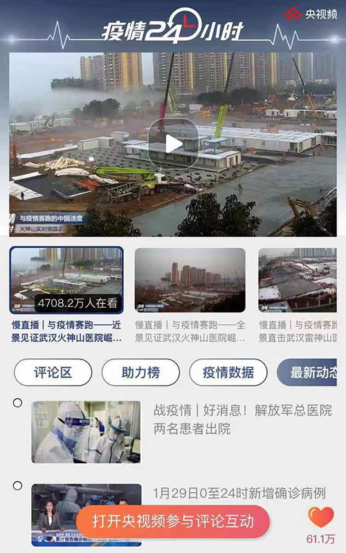中央広播電視総臺(tái)の「央視頻」と中國電信(チャイナテレコム)が協(xié)力して、インターネットのライブ配信を通じて、リアルタイムで武漢火神山醫(yī)院と雷神山醫(yī)院の建設(shè)現(xiàn)場の様子を配信し、中國の人々から高い関心を集めている。ネットユーザーは仮設(shè)病院の建設(shè)現(xiàn)場2ヶ所の様子をそれぞれ間近から撮影した畫像と全體を撮影した畫像のいずれかから選択して視聴することができる。また、醫(yī)院の様子を捉えたライブ配信を視聴できるだけでなく、ライブ配信の畫面下部には新型コロナウイルス感染による肺炎の最新狀況データも流され、コメント欄でインタラクティブな交流を行うこともできるようになっている。
